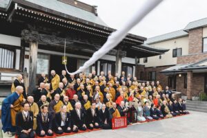 当山開創300周年大法要で建てた結制塔婆。結制塔婆とご本尊さまのお手とを繋いだ白い綱を「善の綱」といって、参拝者が綱に触れることで、仏様と直接縁を結び、功徳【善いご利益】をいただくことができるとされています。