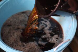 イガを拾い集めるところからはじめます。約90㎝の手ぬぐいサイズに染めた布は、そのままお持ち帰りいただけます。ご希望の方は、後日縫製したものをお渡しいたします。